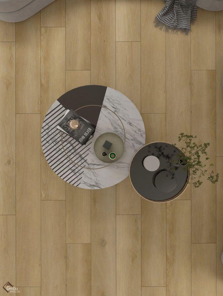 Kvarca vinila grīda ar augstu nodilumizturību, ūdens izturīga, ar fāzēm, ar speciālu amortizējošo apakšklāju, kas izolē skaņu, nodrošina komfortu un labi vada siltumu.
