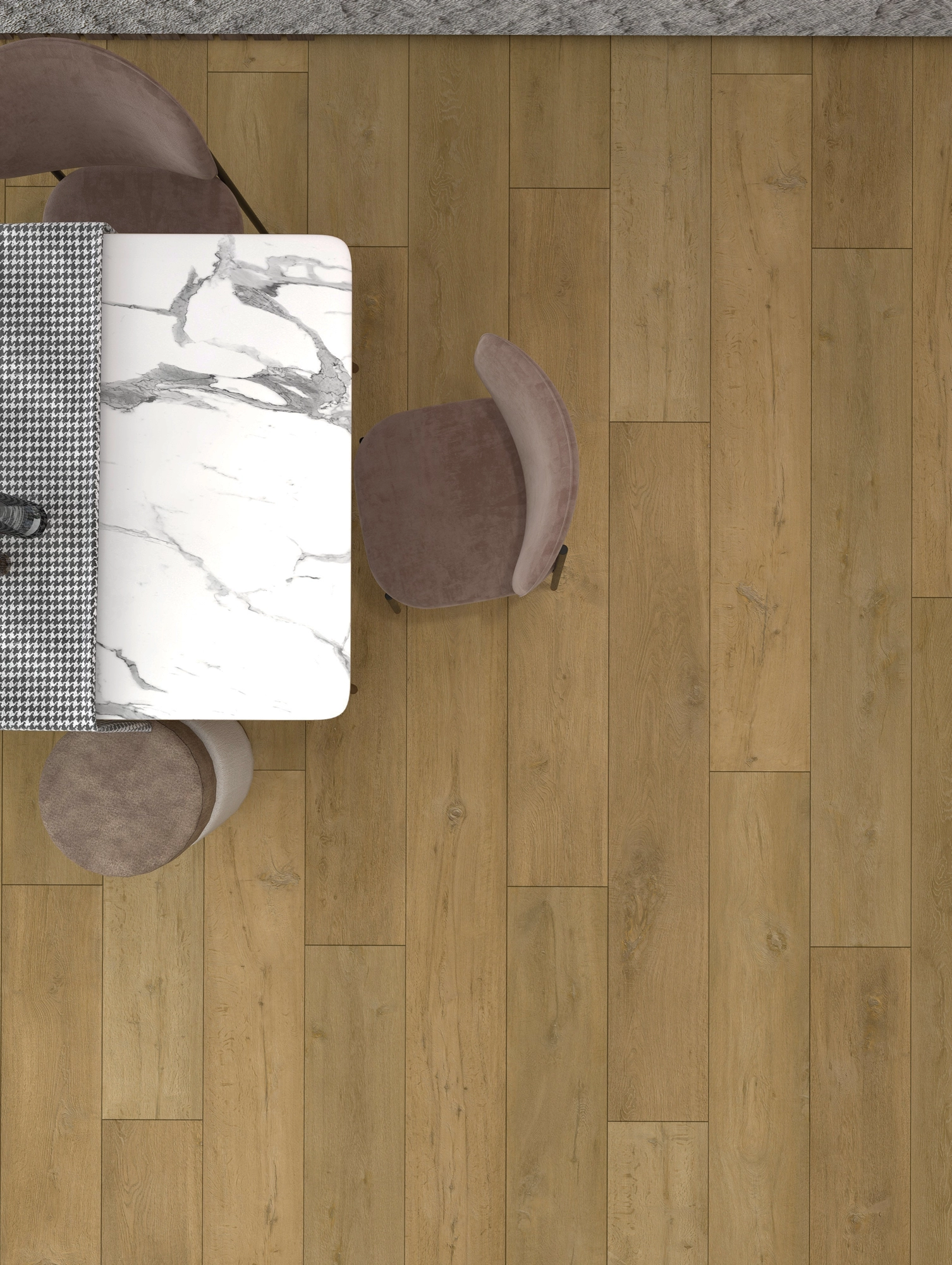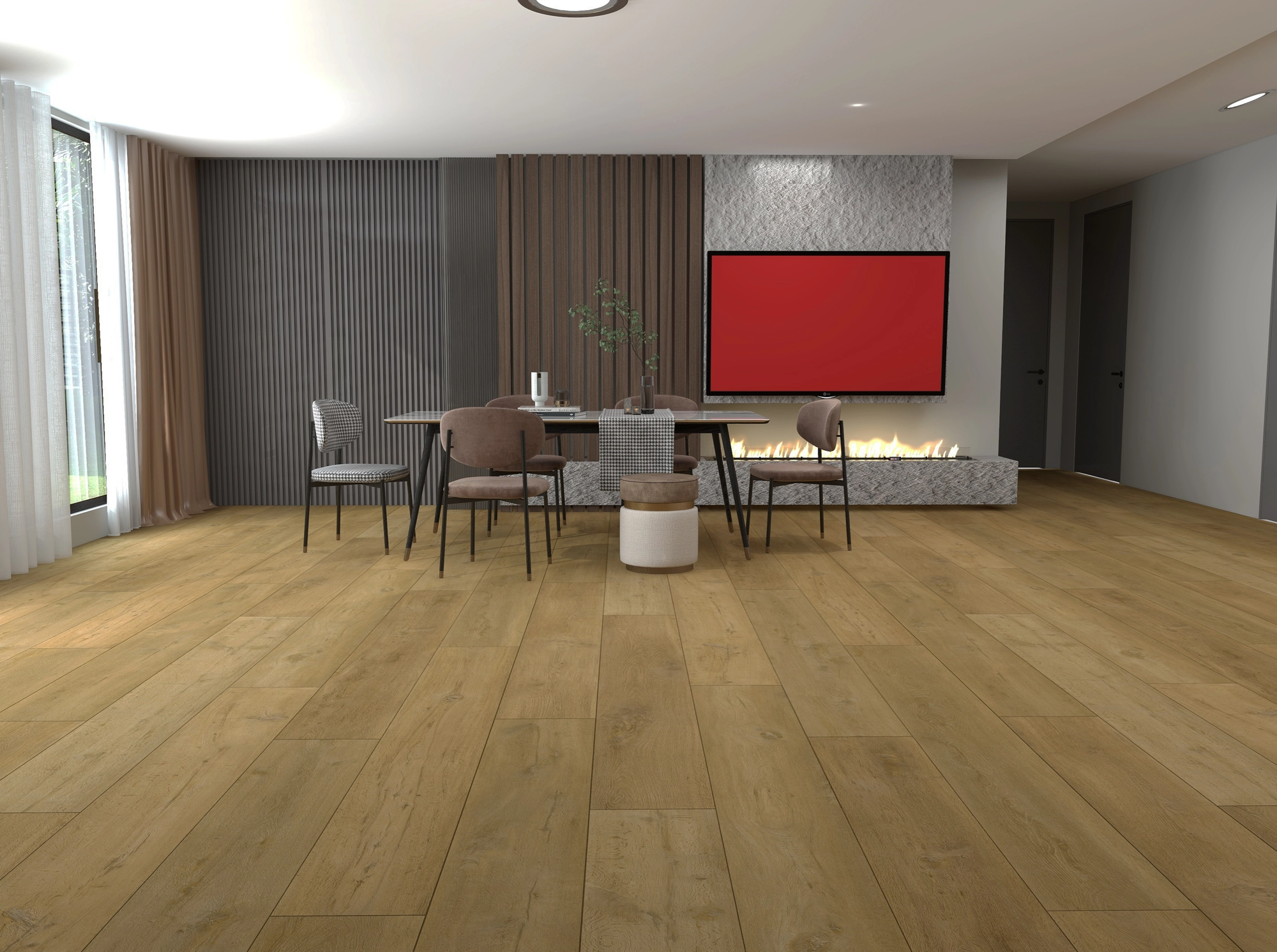 Kvarca vinila grīda ar augstu nodilumizturību, ūdens izturīga, ar fāzēm, ar speciālu amortizējošo apakšklāju, kas izolē skaņu, nodrošina komfortu un labi vada siltumu.