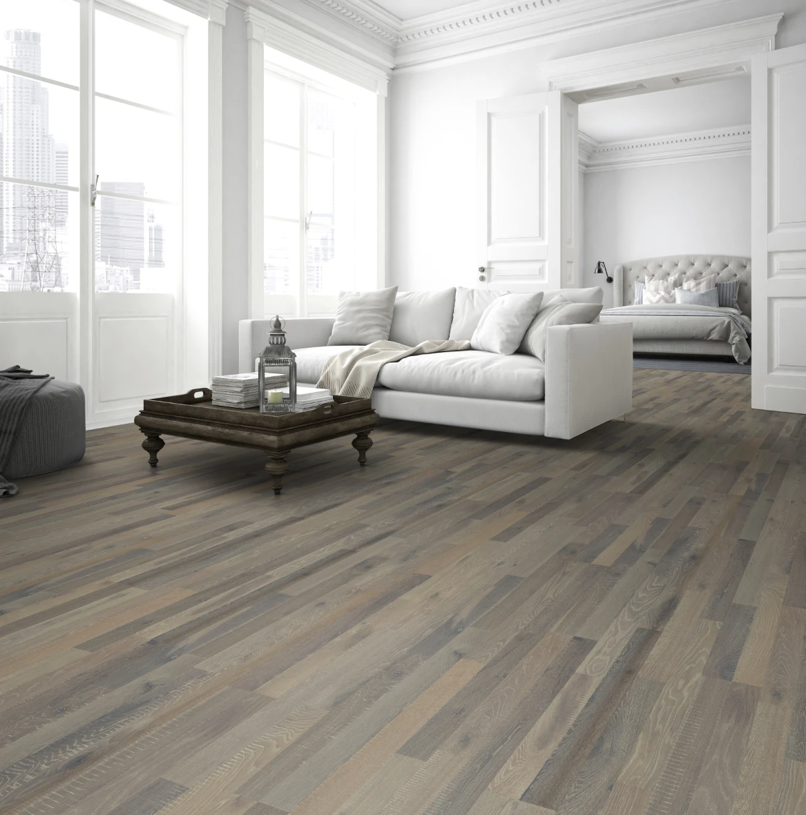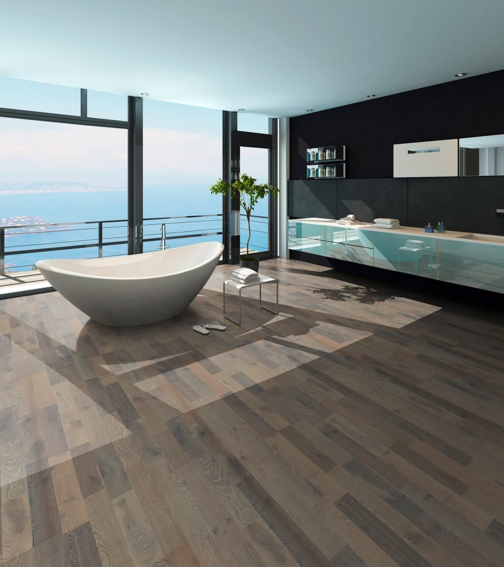 3-slāņu parkets no ozola Bali, divjoslas dēlis, pelēka UV eļļa, dziļi birstēts, ar fazēm no 4-ām pusēm, Country atlasījums, ar vecinājuma efektu