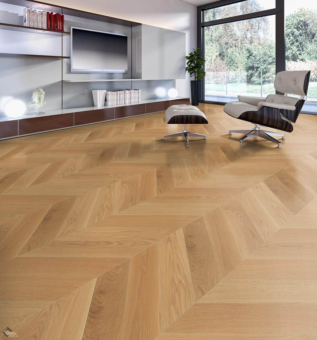 3-slāņu parkets no ozola Corinth, franču skujiņas rakstā, ar 60° leņķi, UV eļļa, birstēts, ar fazēm no 4-ām pusēm , Active atlasījums.