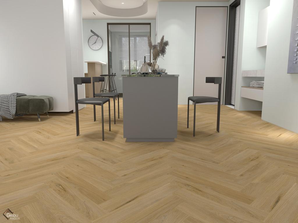 Kvarca vinila grīda, ūdens izrurīga, izturīga pret nodilumu, ar fāzēm, ar speciālu amortizējošo apakšklāju, kas izolē skaņu, nodrošina komfortu un labi vada siltumu.